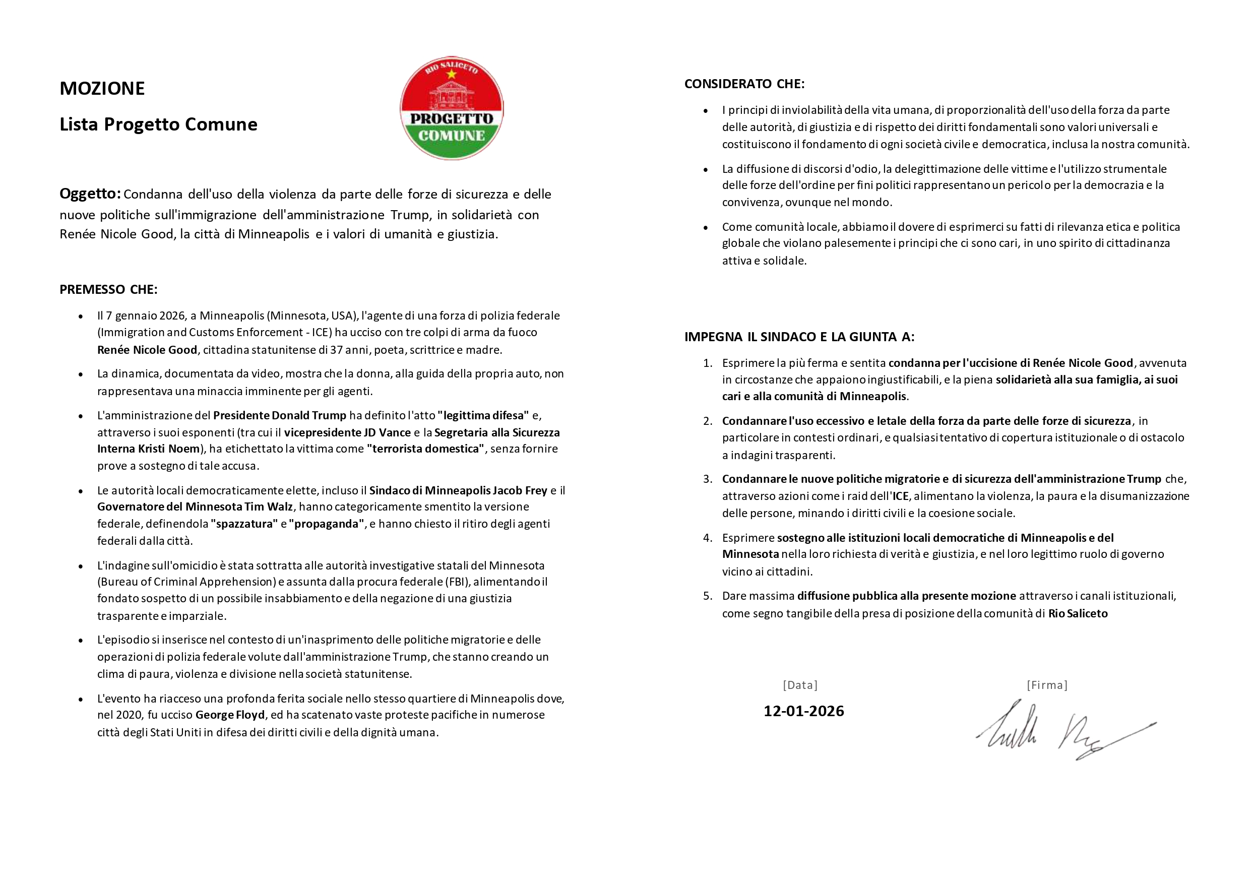 Condanna dell’uso della violenza da parte delle forze di sicurezza e delle nuove politiche sull’immigrazione dell’amministrazione Trump, in solidarietà con Renée Nicole Good, la città di Minneapolis e i valori di umanità e giustizia.