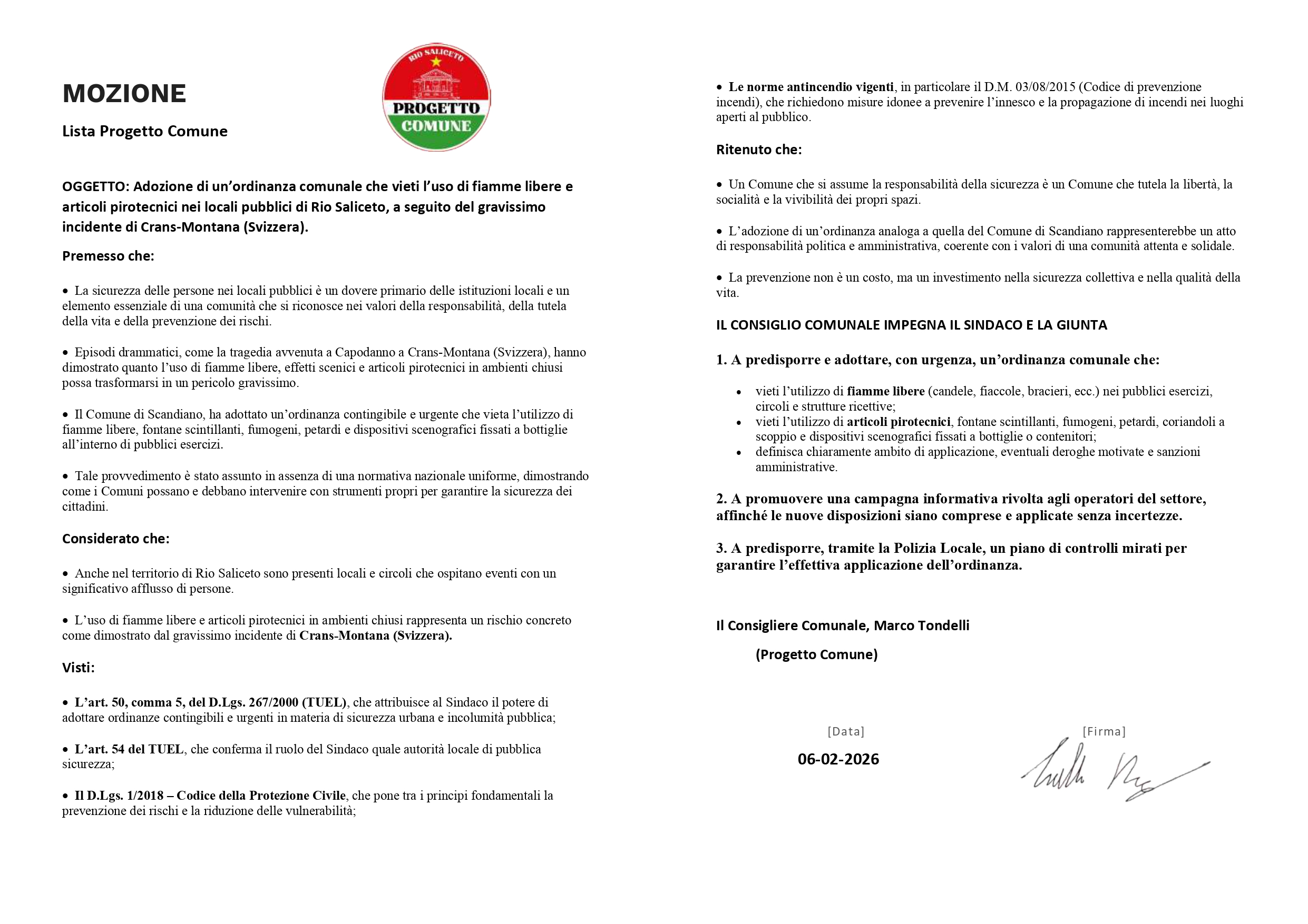Adozione di un’ordinanza comunale che vieti l’uso di fiamme libere e articoli pirotecnici nei locali pubblici di Rio Saliceto, a seguito del gravissimo incidente di Crans-Montana (Svizzera).